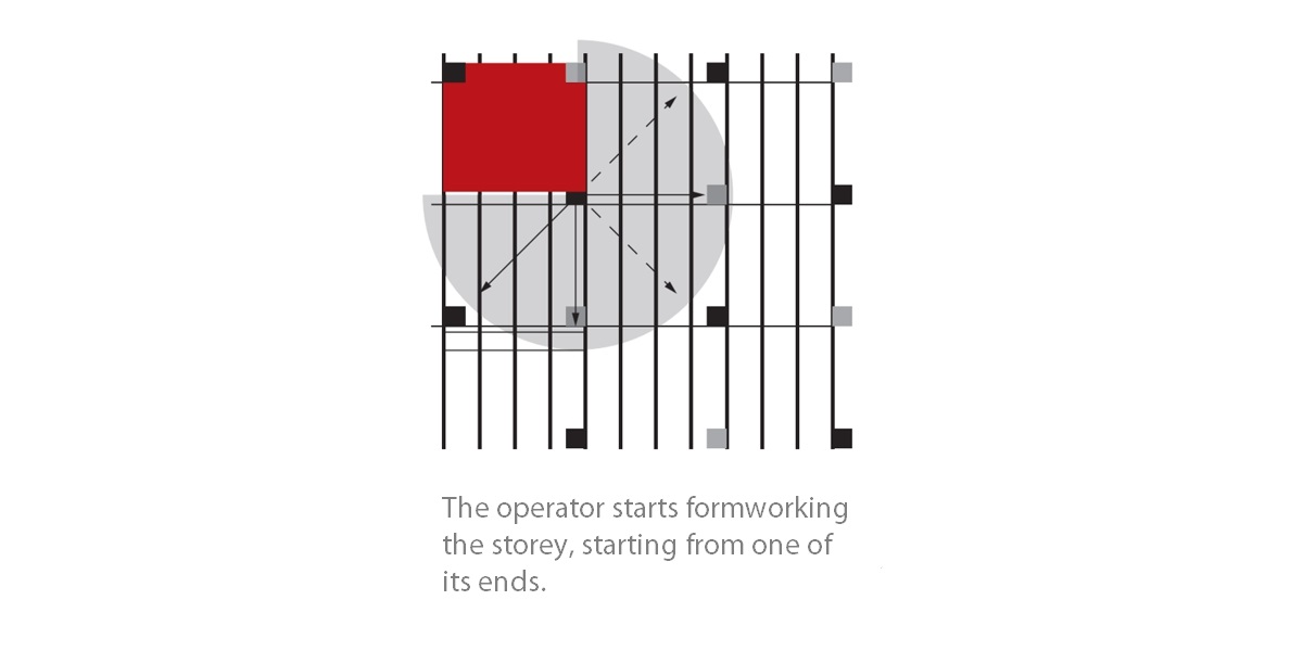 In order to facilitate the work with the system and to optimize its use on the construction site, the storey to be formwork is marked out in advance. The layout of the storeys takes into account the 6.5 m radius of the system operation.