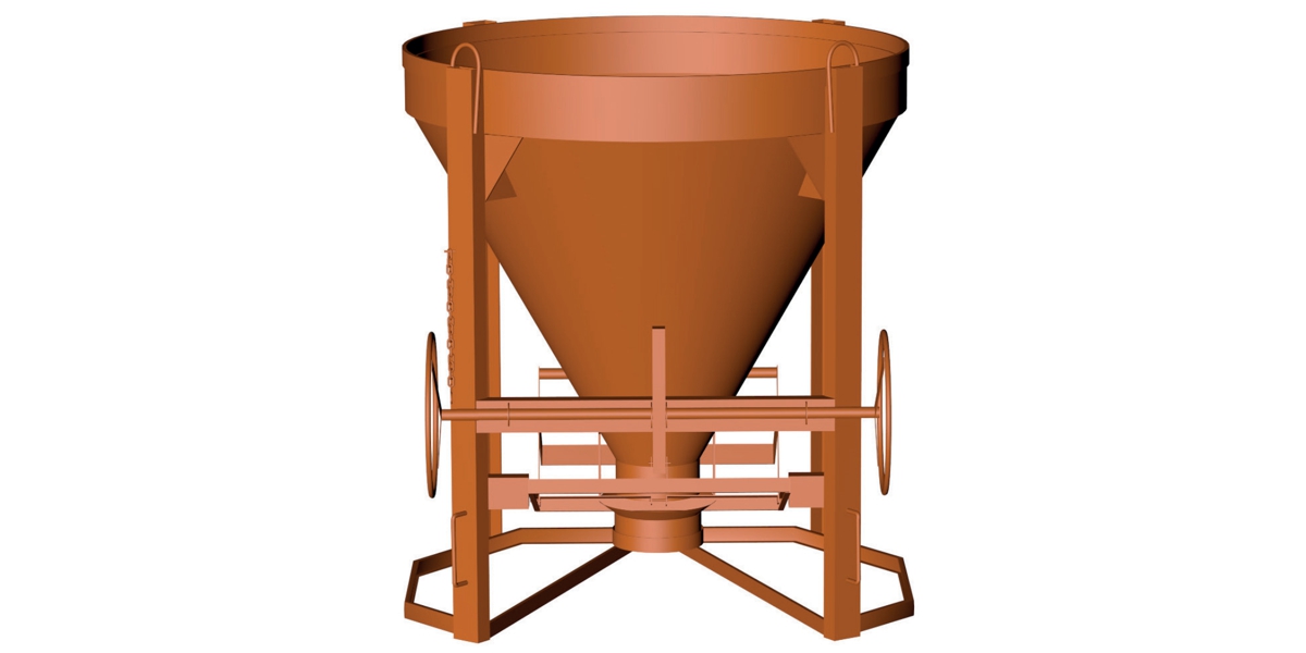 Concrete containers are used to transport concrete mass and other materials of similar consistency by means of cranes. They have a jaw drain mechanism (closing system) that is easy to operate when opening the container drain hole. The appropriate design of the drain mechanism guarantees easy opening of the container with the use of a small amount of effort by the worker. Additionally, the locking system prevents the container from opening automatically during transport of concrete thanks to the use of a gear mechanism. The concrete container with the straight outflow is characterized by a solid structure and high durability. Containers are approved for construction works by the Office of Technical Inspection on the basis of the Declaration of Conformity and the Operation and Maintenance Documentation. Standard containers with the straight outflow are equipped with a 2 m-long drain sleeve with a clamp for fixing it. The drain sleeve is an essential element in construction works, in particular in the construction of columns and pillars.