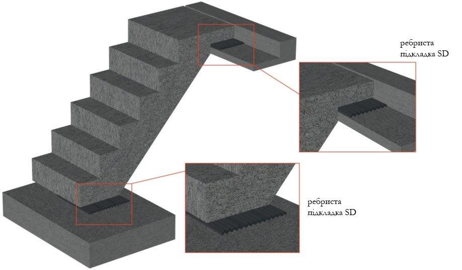 Акустичні ребристі підкладки, призначені для використання в сходах і подібних елементах в квартирах, офісах і лікарнях, ефективно зменшують шум ходьби при контакті з даним елементом будівлі. Завдяки своїм властивостям в цій сфері дуже добре використовуються профільовані неармовані підкладки. Окрім зменшення шуму, вони також забезпечують кращу передачу навантаження та запобігають перевантаженню країв компонентів.
