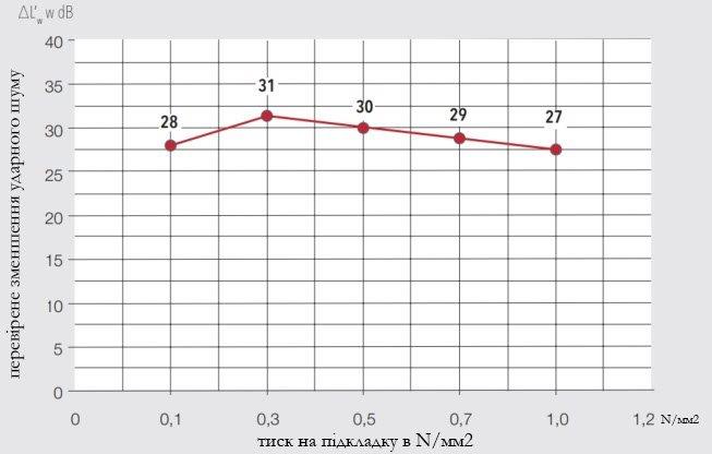 Поліпшення шумозахисту від ходьби в порівнянні з класичним жорстким варінтом становить при тиску від 0,1 до 1,0 N/мм2 щонайменше 27 дБ. Однак при тиску 0,3 N / мм2 поліпшення становить 31 дБ.