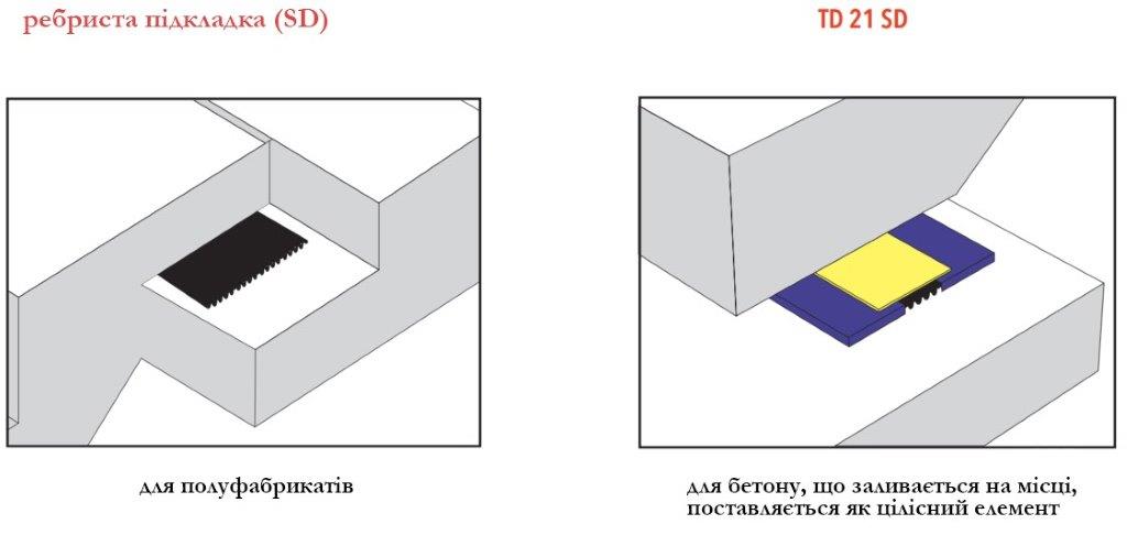 Ребристі підклдки RUBA SD від RUBA, зберігають чудові звукоізоляційні властивості, можуть використовуватися в широкому діапазоні навантажень від 0,1 N/мм2 до 1,0 N/мм2. Тоді вони забезпечують шумопоглинання на рівні не менше 27 дБ. Найкращі параметри шумопоглинання (31 дБ) досягаються при тиску 0,3 Н / мм2.