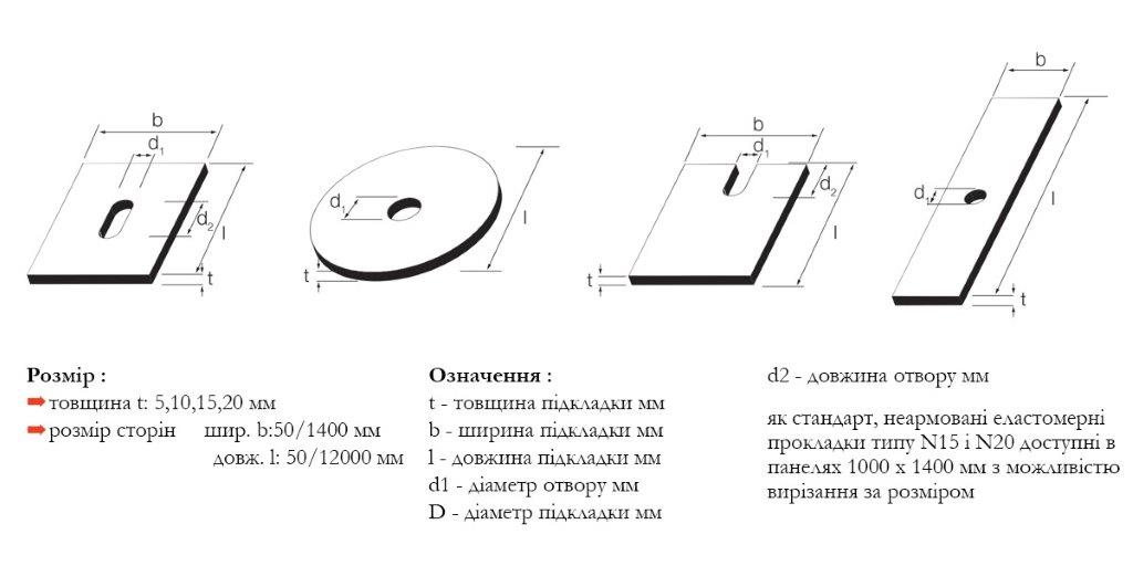 Неармовані еластомерні підкладки N15 і N20 виготовляються товщиною 5 мм, 10 мм, 15 мм і 20 мм. Коротша сторона повинна мати довжину, принаймні, в п'ять разів більше товщини підкладки. Підкладка повинна бути розміщена в області статичного підкріплення опори і опорного елемента.