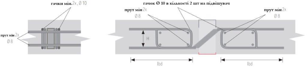 Схема визначення вантажопідйомності і додаткового армування підвисок, що передають сили зсуву, на вантажопідйомність систем більшої кількості підвисок, ланцюги управління яких перекриваються, і плит з більш високим ступенем армування, ніж мінімальна, повинна перевірятися відповідно до положень, що містяться в PN-EN 1992-1-1 і наведеними нижче, за умови, що вантажопідйомність стали примирної підвиску не перевищує 41,3 кн.